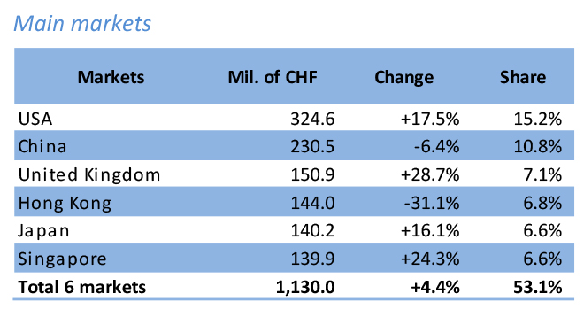 Trends in most markets remained very favourable in June. The growth of watch exports to the United States remained very strong (+17.5%) even though it was halved compared to the first five months of the year and had to contend with a very negative base effect. The Chinese market (-6.4%) benefited from the gradual easing of anti-Covid measures after two months of partial closure, but it was compared to a particularly high benchmark, as the figures for June 2021 were almost double (+93.7%) those of 2019. Hong Kong (-31.1%) suffered one of the biggest drops in the last twelve months, sinking below one of its poorest levels ex-Covid. Most other markets, both in Asia and Europe, saw a growth of between 10% and 65%.